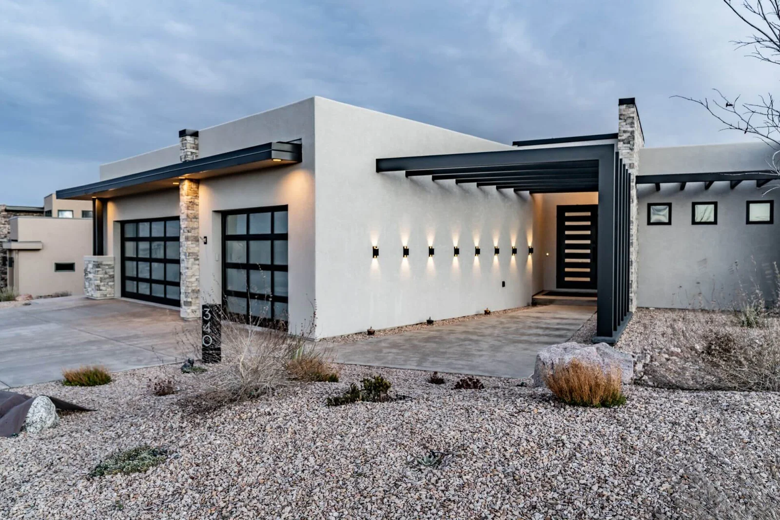 Designed with sleek, modern lines, Kestrel Ridge features an architectural balance of clean stucco finishes, natural stone accents, and metal elements. The home’s low-profile, flat rooflines and expansive glass walls create an elegant yet understated presence against the dramatic backdrop of Colorado’s rugged terrain. The thoughtfully composed exterior and innovative design seamlessly blend with the natural landscape, offering sweeping views of the surrounding desert and mountains.