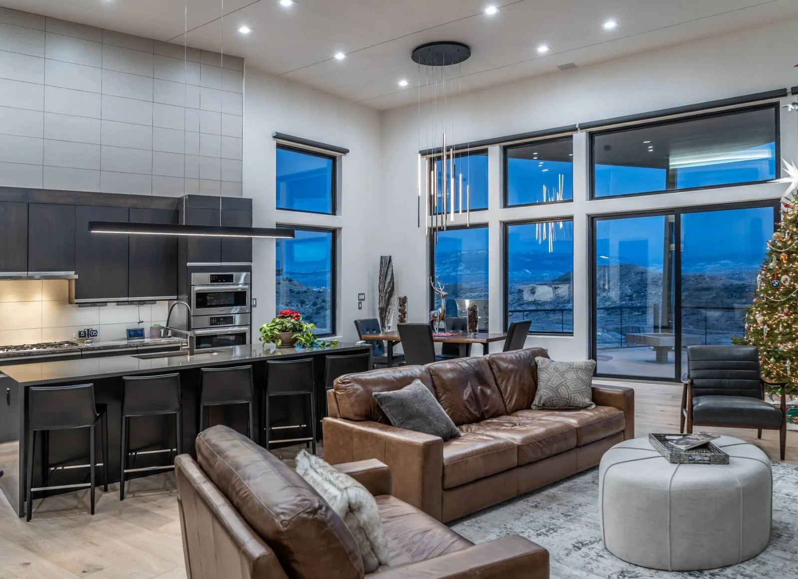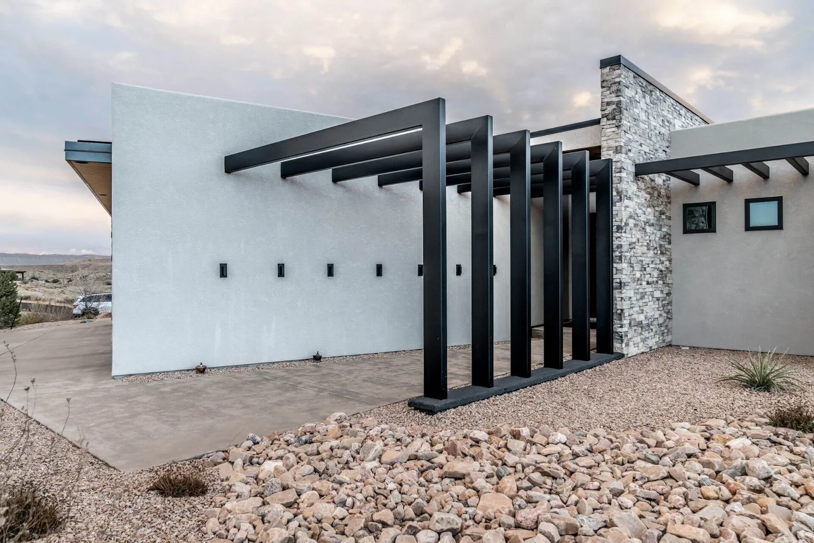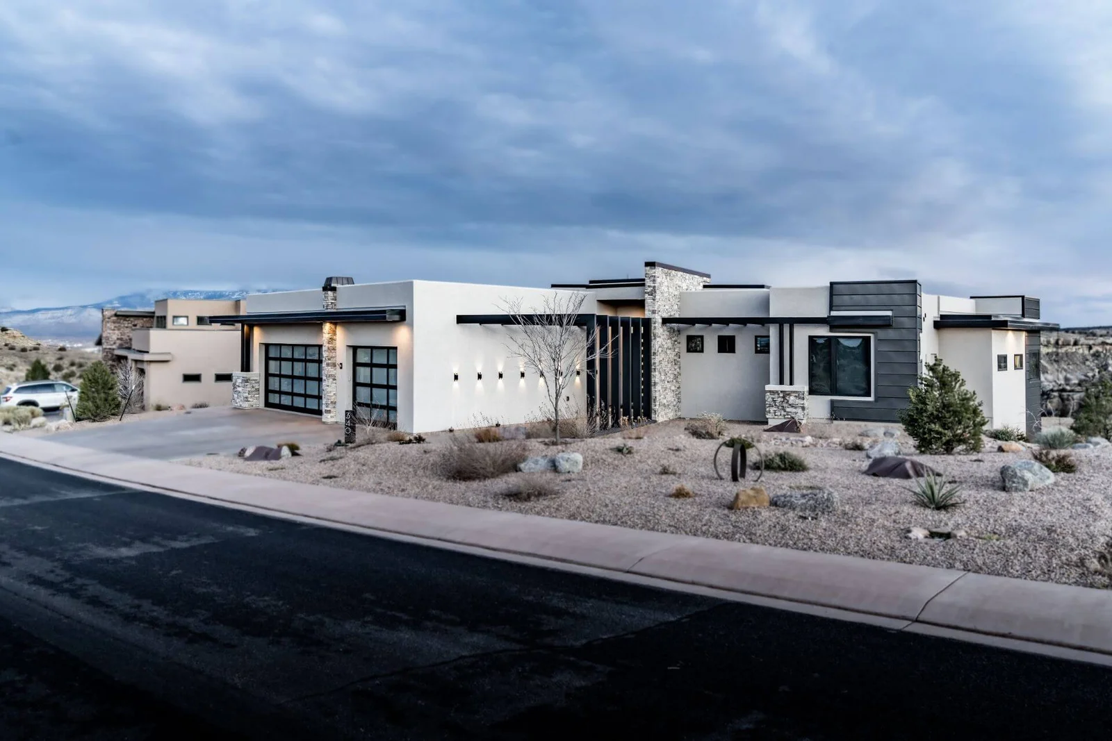 Designed with sleek, modern lines, Kestrel Ridge features an architectural balance of clean stucco finishes, natural stone accents, and metal elements. The home’s low-profile, flat rooflines and expansive glass walls create an elegant yet understated presence against the dramatic backdrop of Colorado’s rugged terrain. The thoughtfully composed exterior and innovative design seamlessly blend with the natural landscape, offering sweeping views of the surrounding desert and mountains.