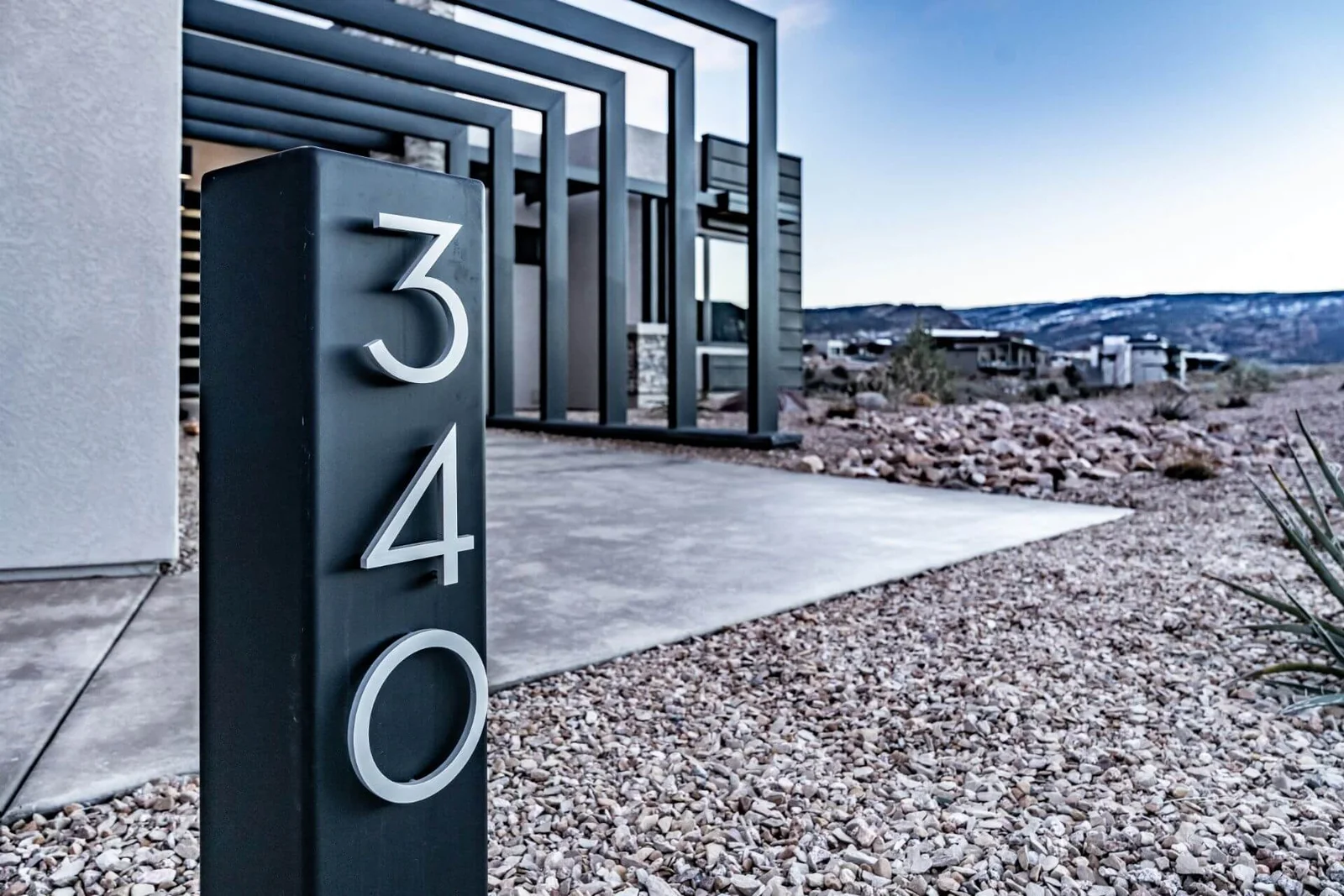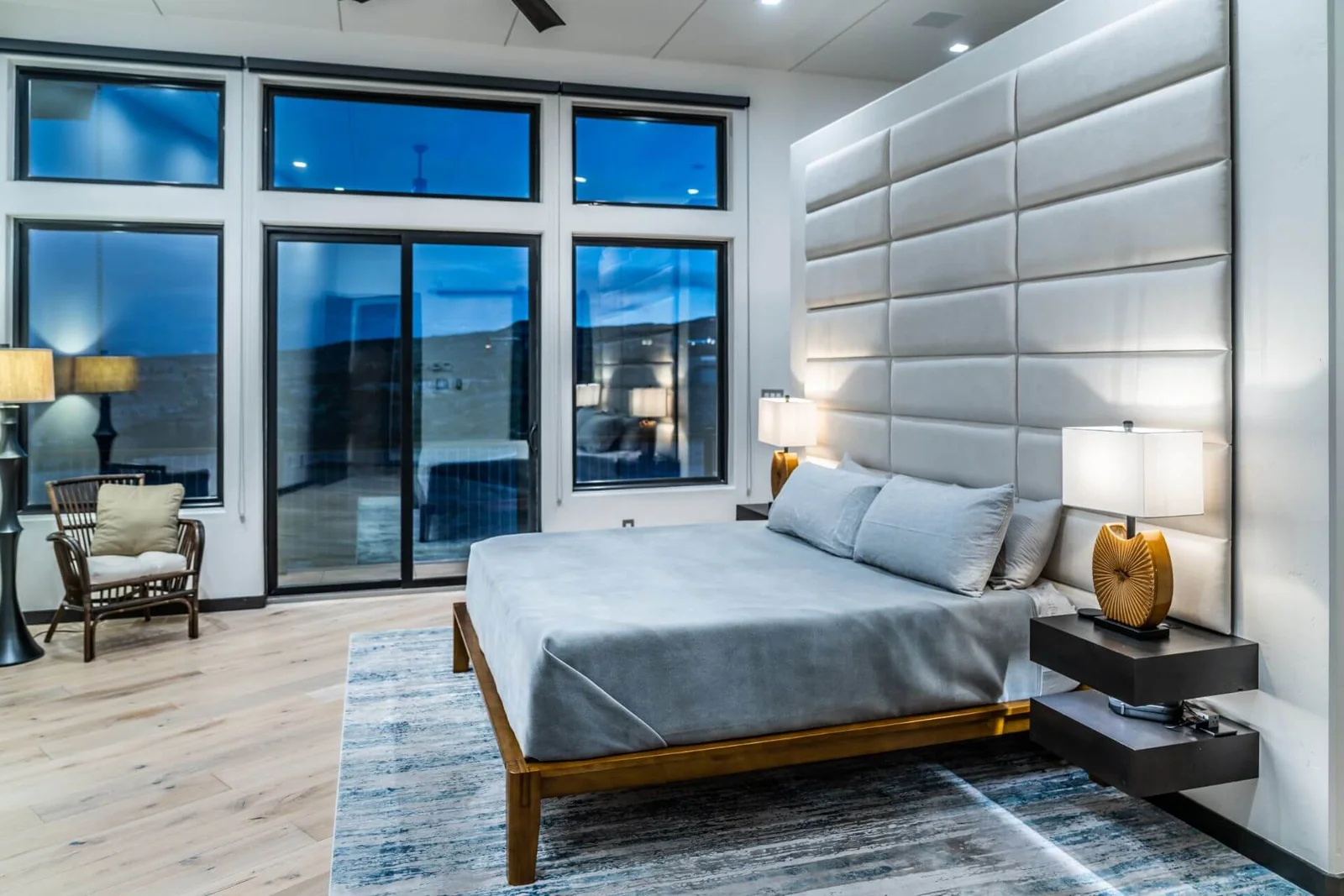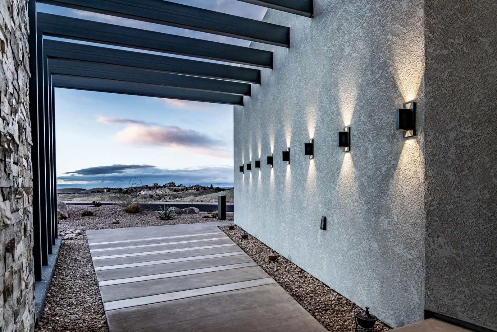 Designed with sleek, modern lines, Kestrel Ridge features an architectural balance of clean stucco finishes, natural stone accents, and metal elements. The home’s low-profile, flat rooflines and expansive glass walls create an elegant yet understated presence against the dramatic backdrop of Colorado’s rugged terrain. The thoughtfully composed exterior and innovative design seamlessly blend with the natural landscape, offering sweeping views of the surrounding desert and mountains.