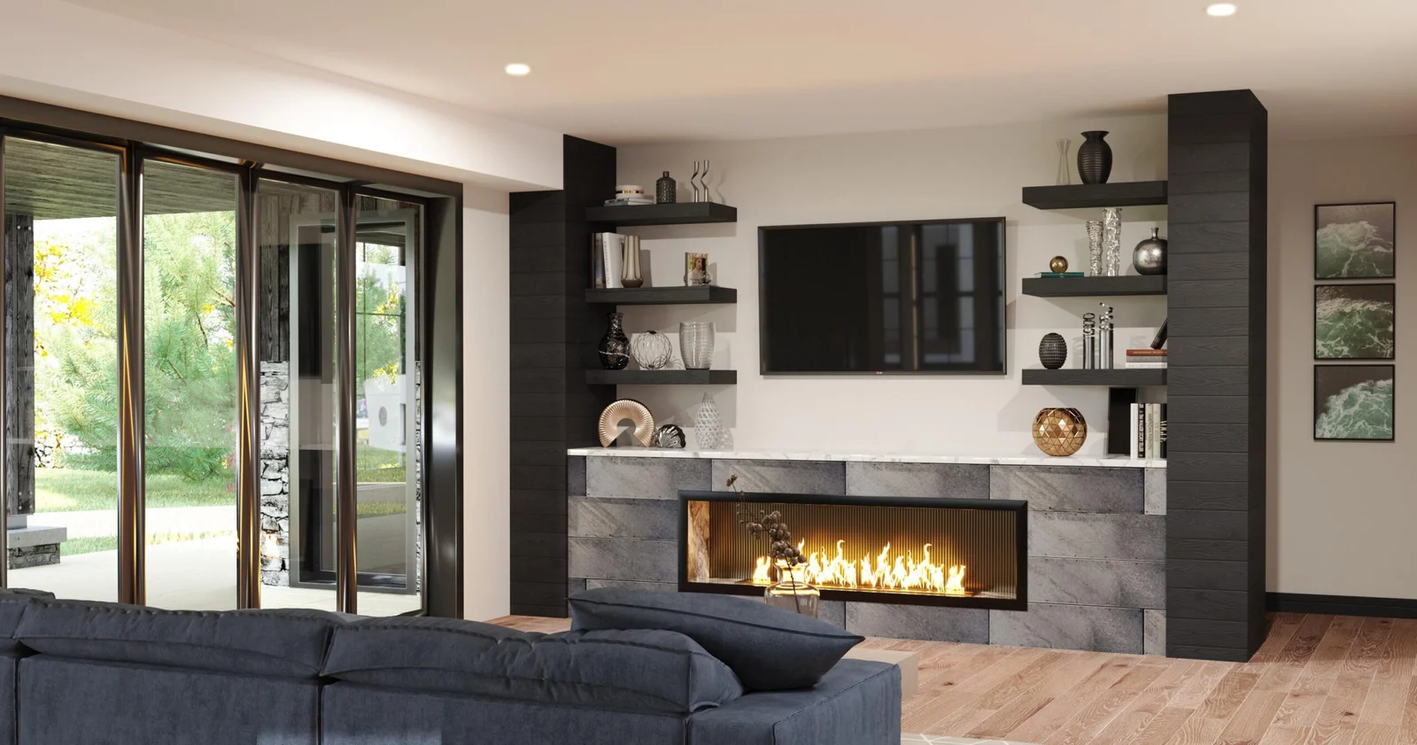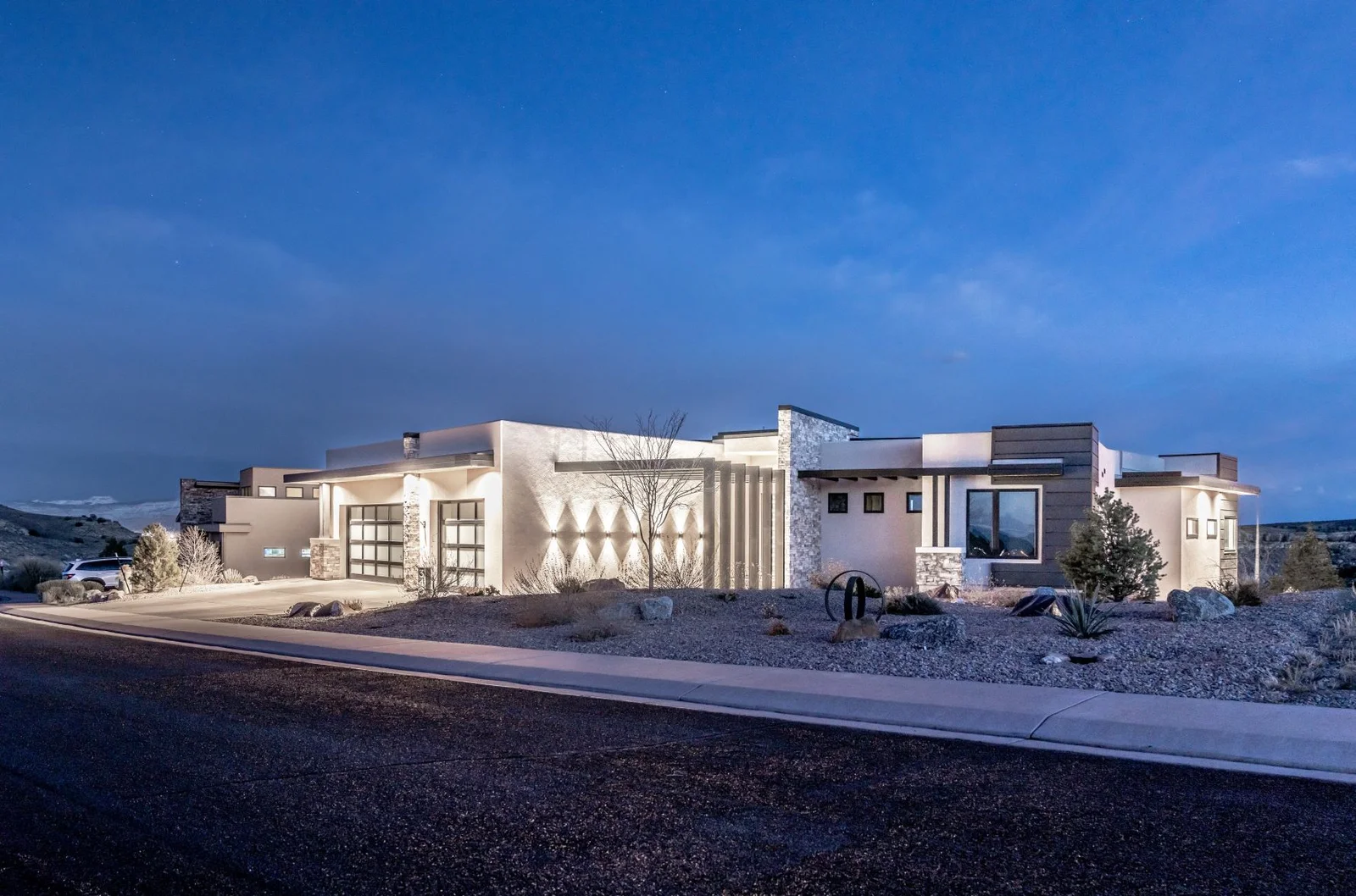 The Midland Loop home features a unique architectural design with a harmonious mix of natural materials, creating a striking contrast between sleek modern elements and the organic forms of its surroundings. The home’s façade showcases large windows, allowing light to pour into the interior while offering unobstructed views of the surrounding mountains and valley. Clean, geometric lines complement rustic wood accents, providing a contemporary yet warm and inviting aesthetic.
