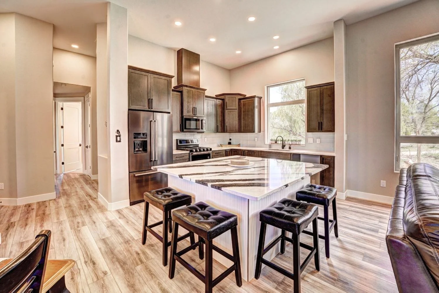 Nestled in a quiet, snow-covered neighborhood, the Sienna Creek home spans an expansive lot and features a striking mix of natural stone, timber elements, and bold architectural lines. The design embraces the surrounding landscape while offering spacious interiors, large windows for panoramic views, and a warm, inviting aesthetic. With a strong focus on comfort, sustainability, and timeless style, this project reflects Kraai Design’s commitment to blending form and function in perfect harmony.