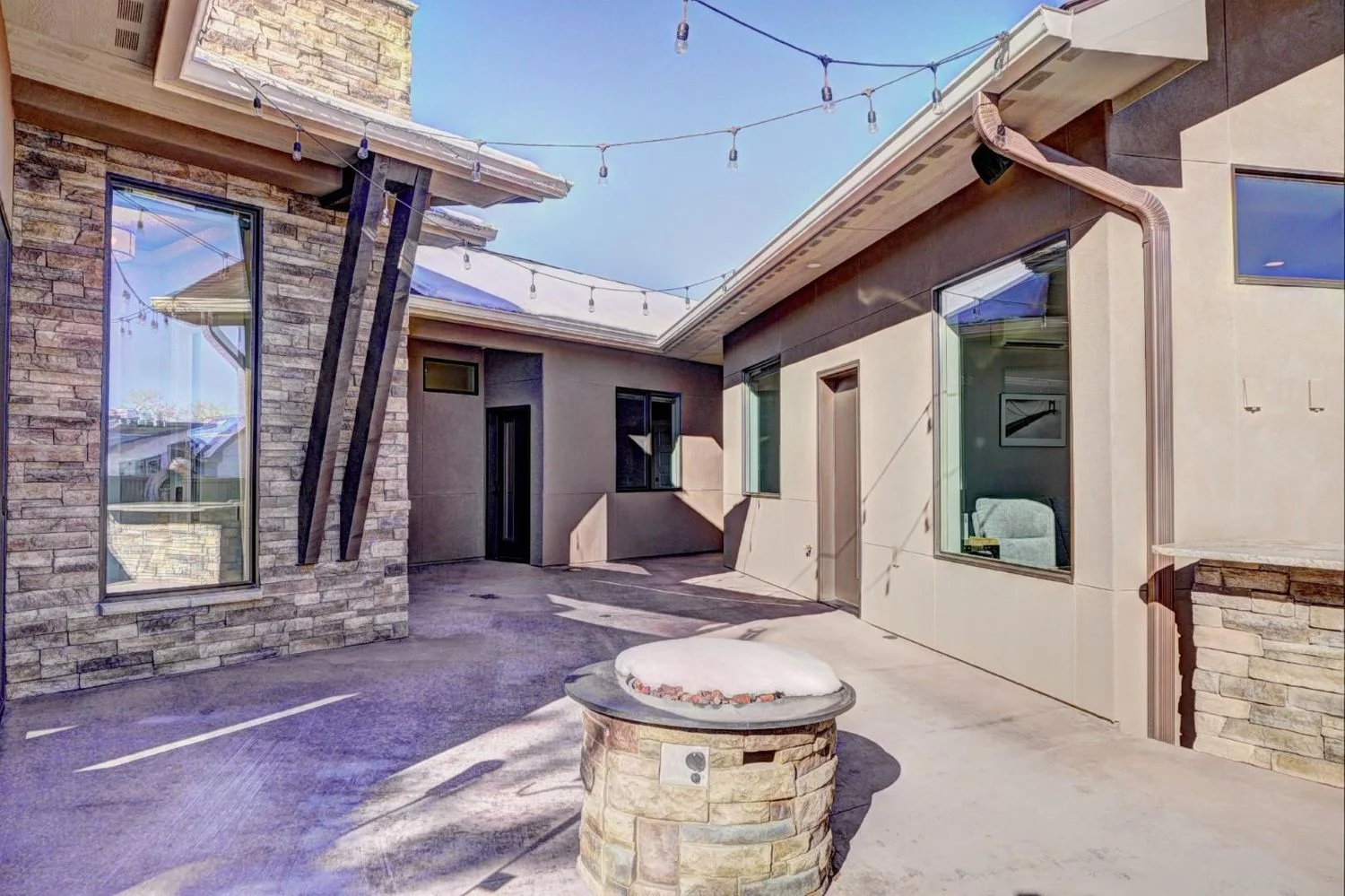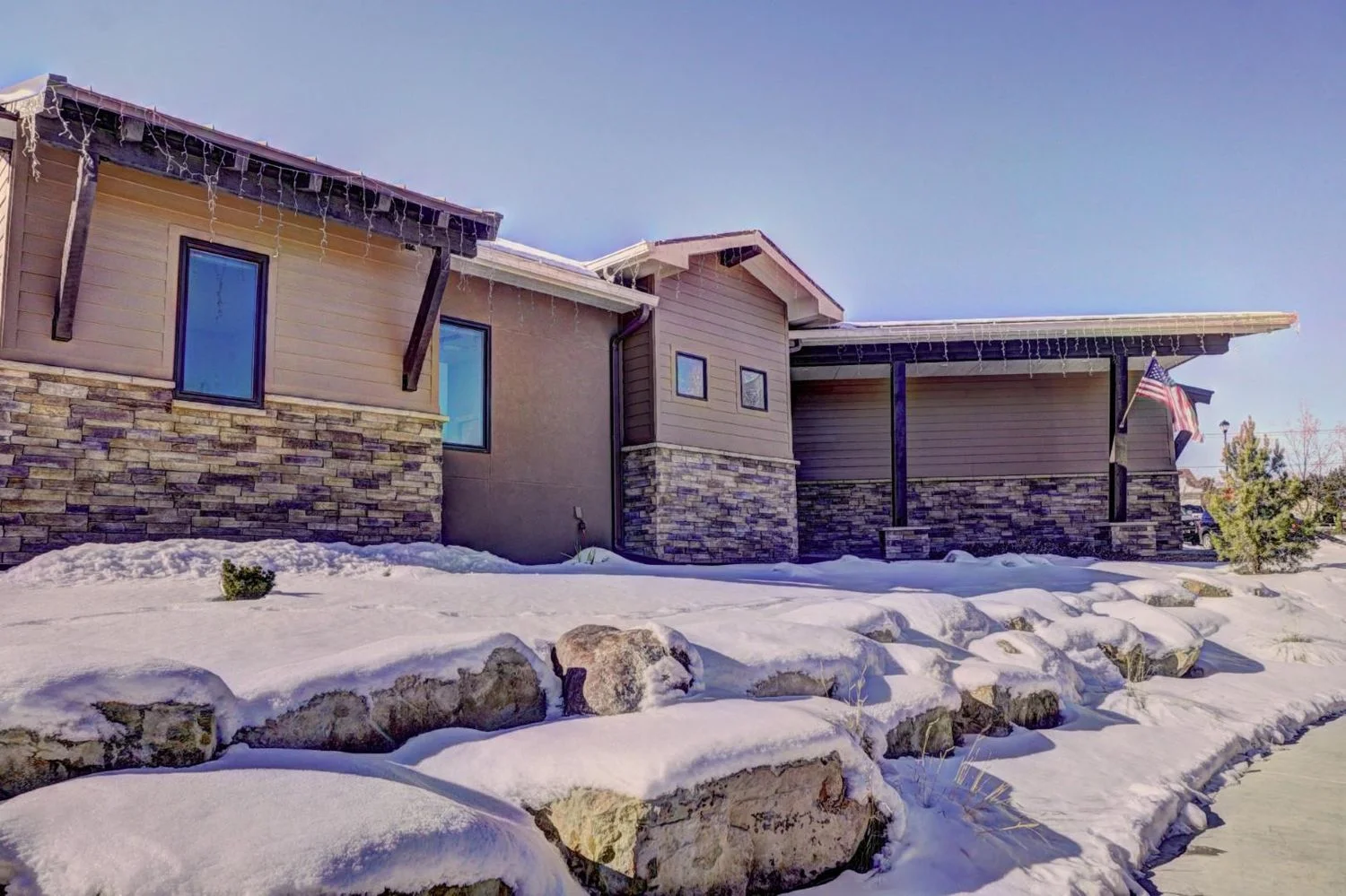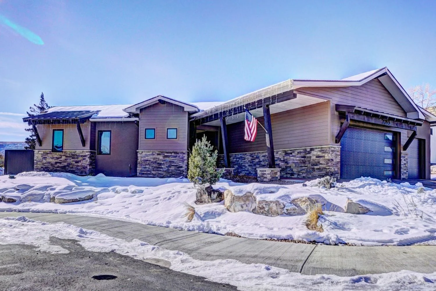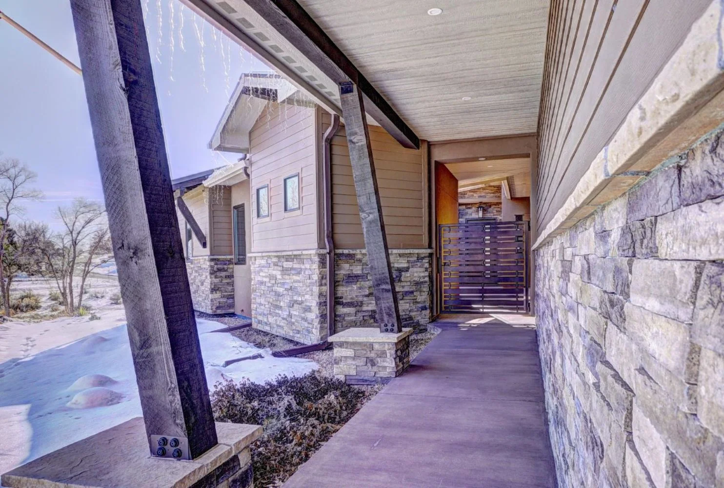 Nestled in a quiet, snow-covered neighborhood, the Sienna Creek home spans an expansive lot and features a striking mix of natural stone, timber elements, and bold architectural lines. The design embraces the surrounding landscape while offering spacious interiors, large windows for panoramic views, and a warm, inviting aesthetic. With a strong focus on comfort, sustainability, and timeless style, this project reflects Kraai Design’s commitment to blending form and function in perfect harmony.