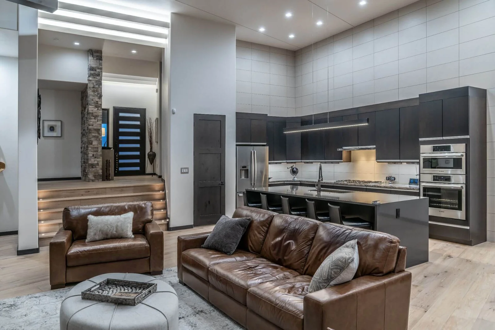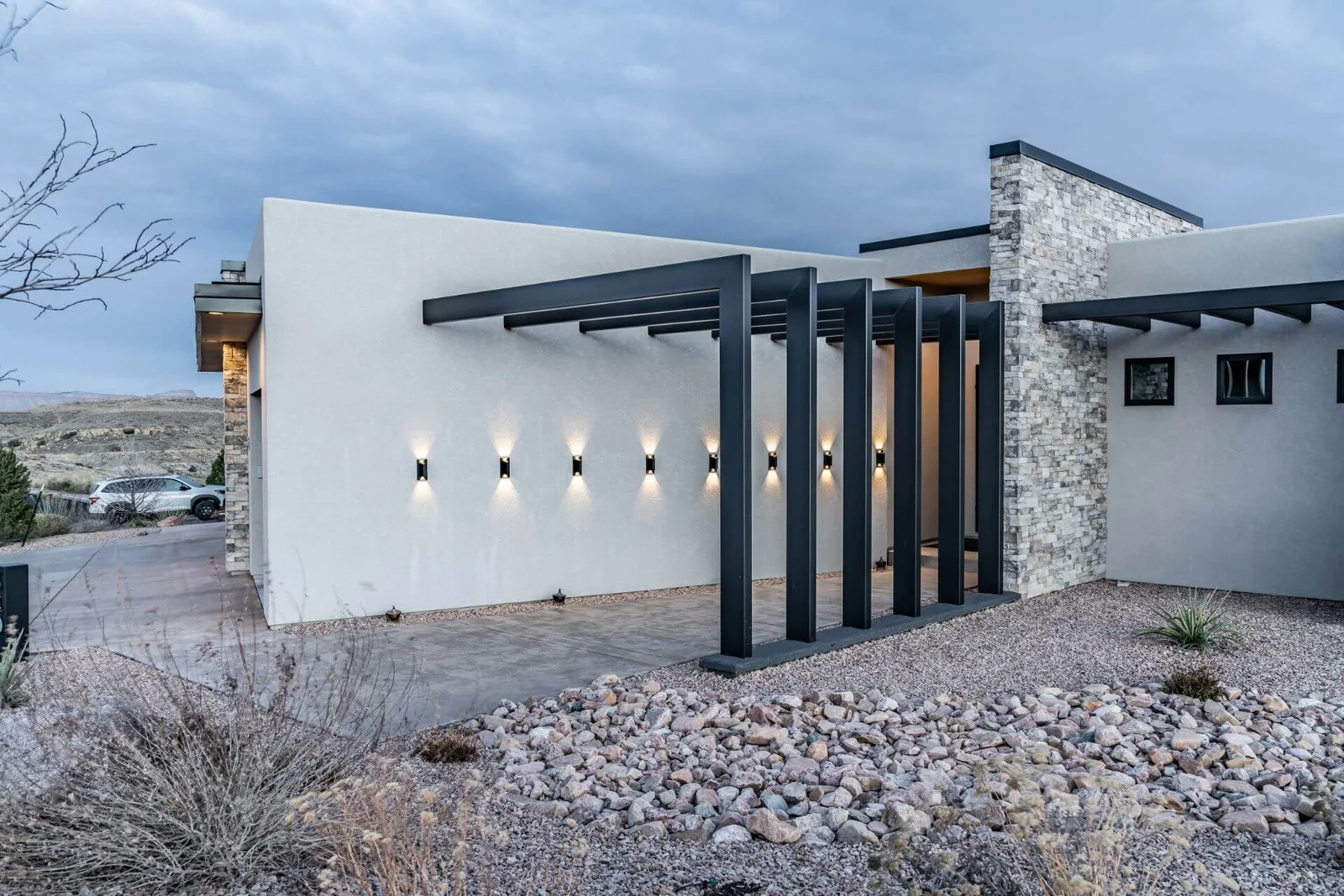 Designed with sleek, modern lines, Kestrel Ridge features an architectural balance of clean stucco finishes, natural stone accents, and metal elements. The home’s low-profile, flat rooflines and expansive glass walls create an elegant yet understated presence against the dramatic backdrop of Colorado’s rugged terrain. The thoughtfully composed exterior and innovative design seamlessly blend with the natural landscape, offering sweeping views of the surrounding desert and mountains.