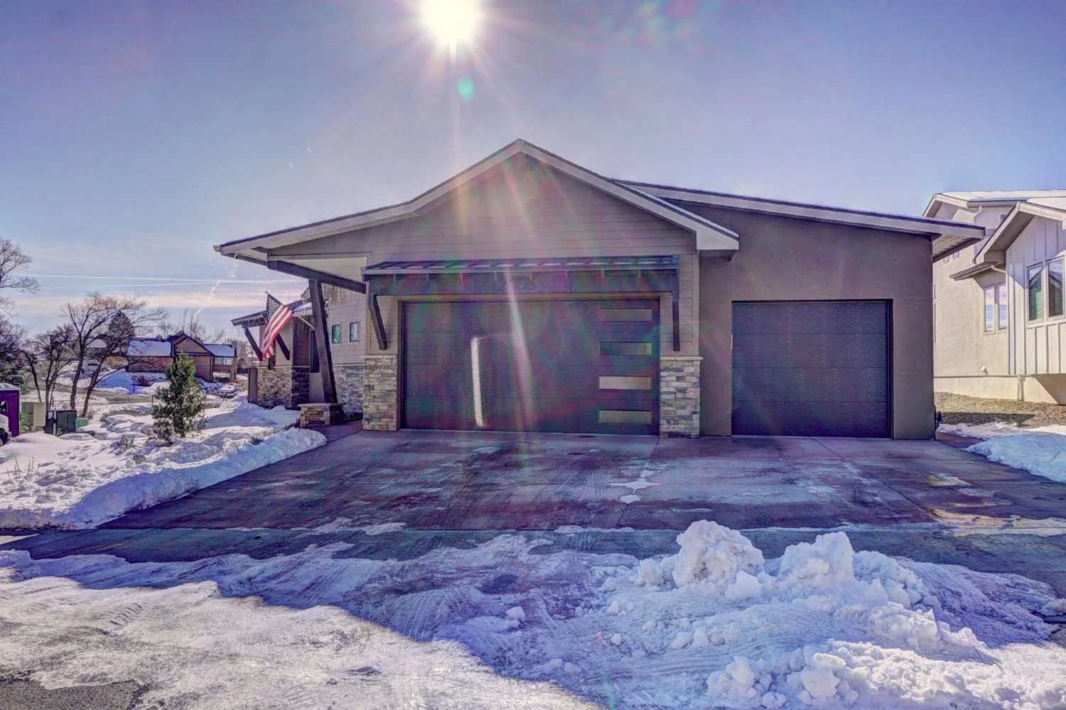 Nestled in a quiet, snow-covered neighborhood, the Sienna Creek home spans an expansive lot and features a striking mix of natural stone, timber elements, and bold architectural lines. The design embraces the surrounding landscape while offering spacious interiors, large windows for panoramic views, and a warm, inviting aesthetic. With a strong focus on comfort, sustainability, and timeless style, this project reflects Kraai Design’s commitment to blending form and function in perfect harmony.